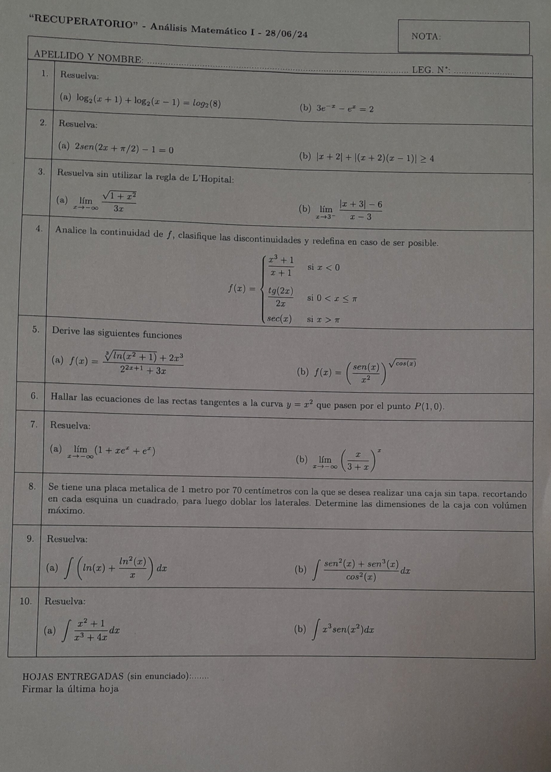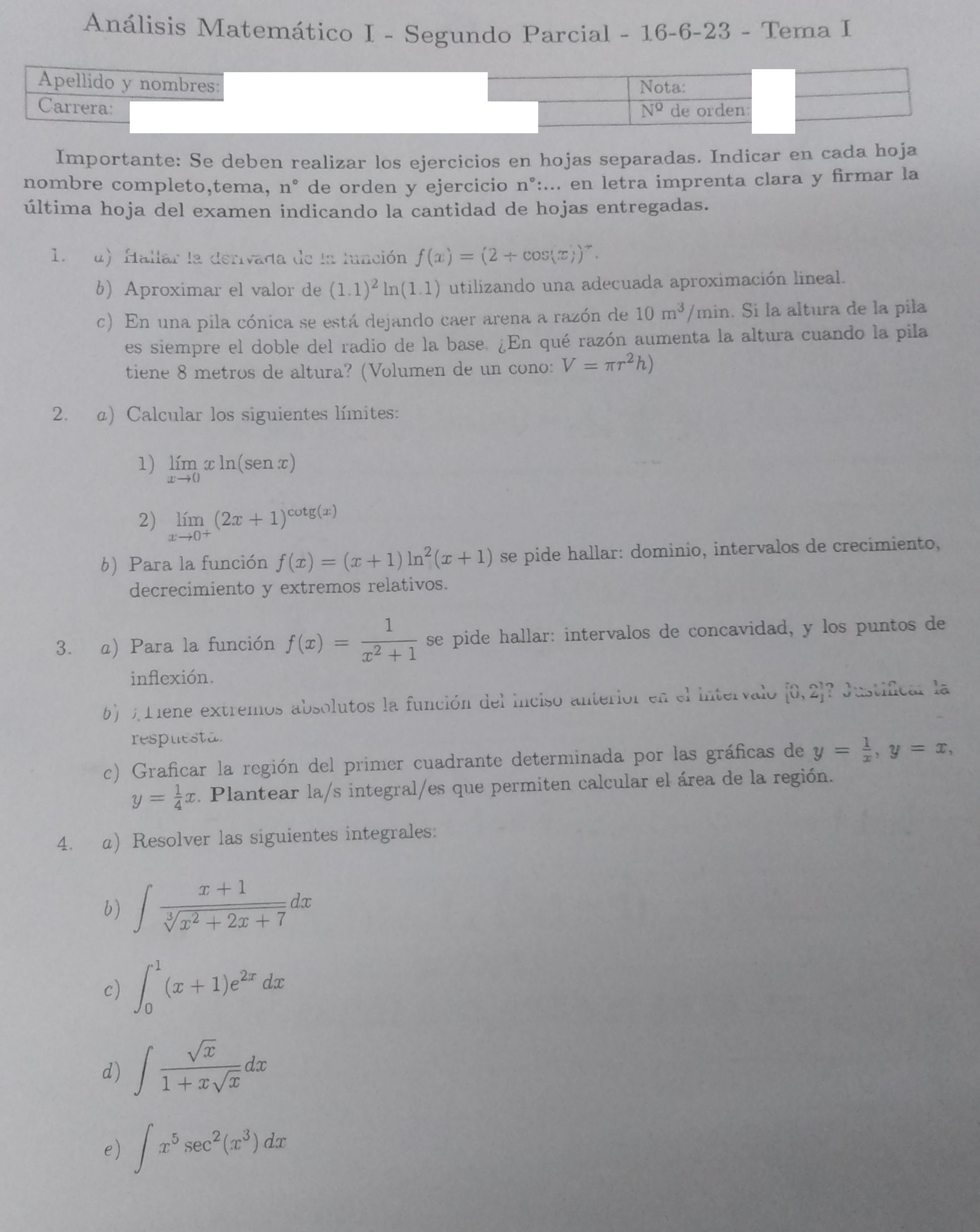 2do Parcial Primer Cuatrimestre 2023. Temas: Aplicación de Derivadas, Regla de L'hopital, Integrales.
